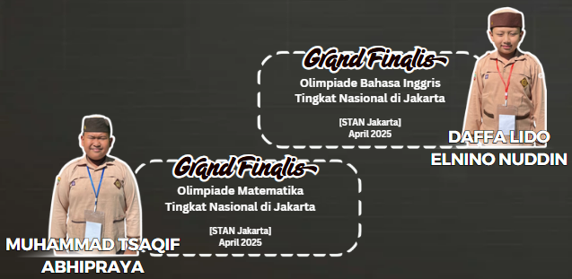 Adapun siswa berprestasi tersebut adalah Daffa Lido Elnino Nuddin yang menjadi grand finalis Olimpiade Bahasa Inggris, serta Muhammad Tsaqif Abhipraya sebagai grand finalis Olimpiade Matematika. Keberhasilan keduanya melaju hingga tahap grand final menunjukkan kemampuan akademik, ketekunan belajar, serta daya saing siswa SD IT Azizah di tingkat nasional.